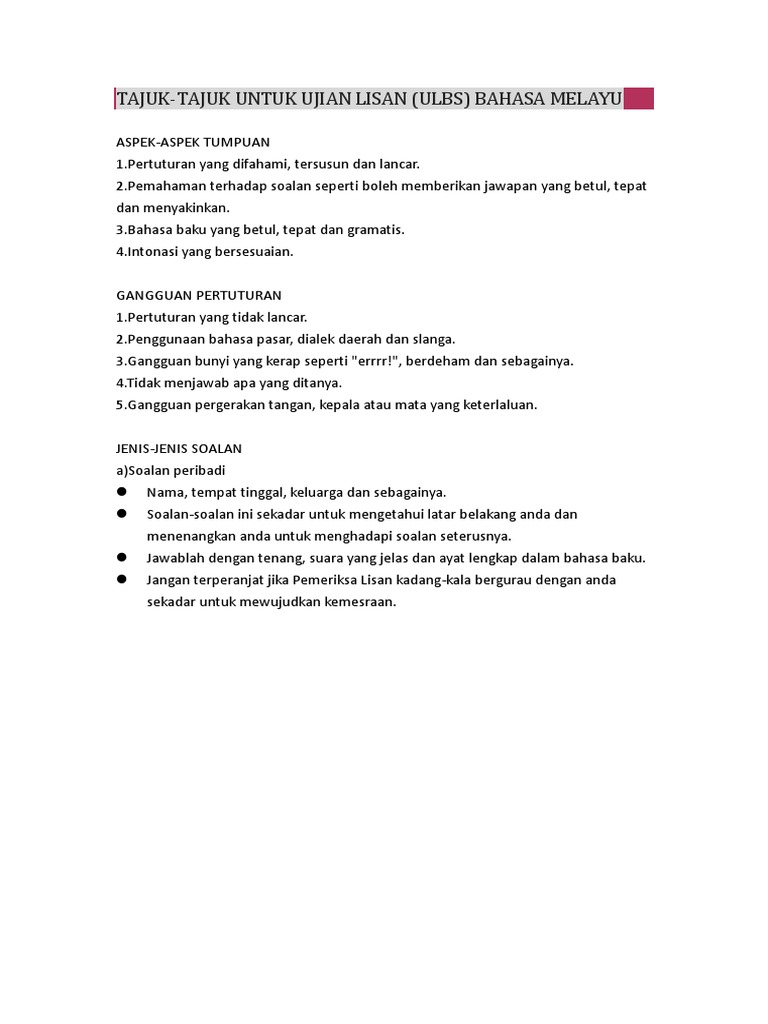 Ujian LisanBertutur Bahasa Melayu SPM. Contoh Soalan Cadangan Jawapan Ramalan Panduan Tips Panduan Peringatan. Contoh Ujian Lisan Bahasa Melayu Bertutur PT3 BM 2022.